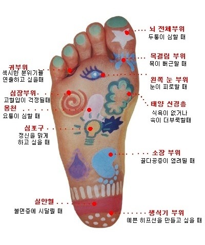 몸의 축소판’이라 불리는 발은 아픈 곳에 해당하는 부위를 마사지해 주면 통증이 가라앉는다.