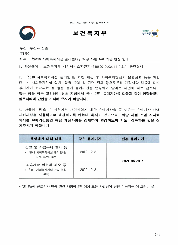 2019 사회복지시설 관리안내 유예기간 연장 알림
