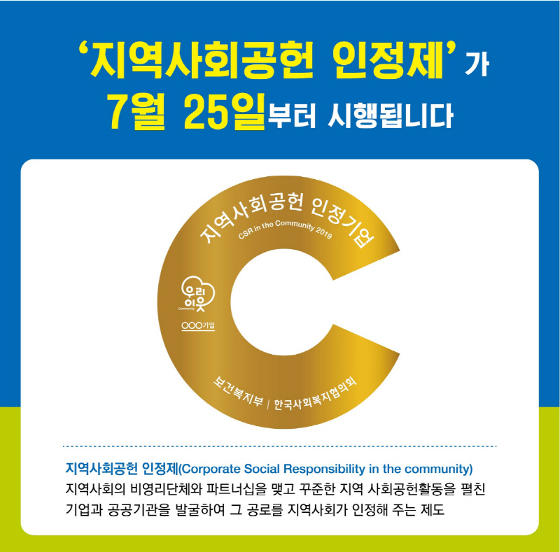 2019. 7. 25.(목) 지역사회공헌 인정제 시행에 따라 다음과 같이 시행공고를 안내하오니, 많은 기업·기관 임직원의 관심과 참여 바랍니다.