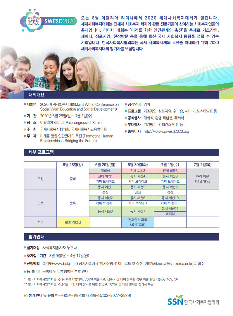 카테고리 없음 2020 세계사회복지대회 참가자 추가 모집 안내(3.9~4.17) by 서울나그네 2020. 3. 9. (붙임)(양식)2020세계사회복지대회 참가신청서.hwp 0.11MB 반응형 공유하기 게시글 관리 서울나그네의 대한민국 잡학사전 coreaone.net 저작자표시 비영리 동일조건 (새창열림) 댓글