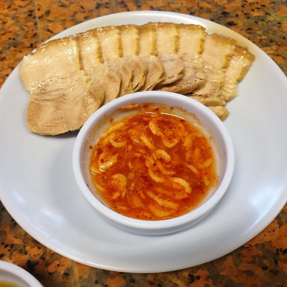 수육은 한접시에 9조각이 나오는데 보시다시피 살반 비계반 정도로 조화를 이루긴 합니다.