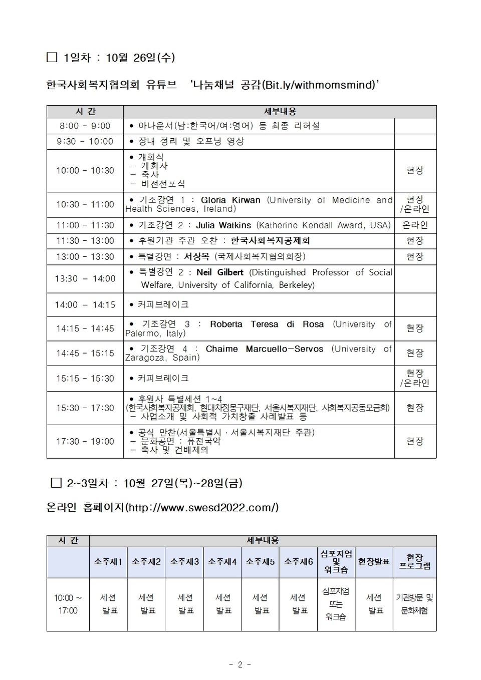 대회 1일차는 서울가든호텔에서 개막식, 기조강연, 특별세션, 환영 리셉션 순으로 진행하며, 한국사회복지협의회 유튜브 ‘나눔채널 공감(Bit.ly/withmomsmind)’을 통해 온라인으로 참여할 수 있다.