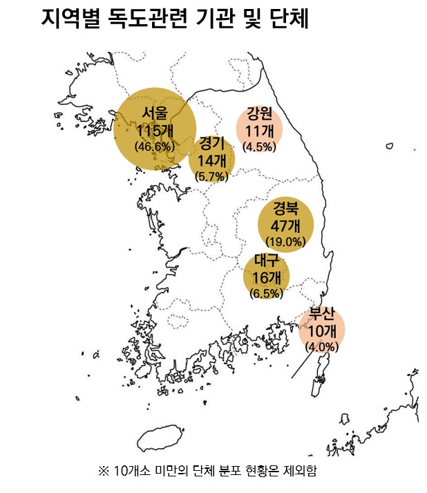 국내외에서 다양한 독도수호활동을 전개하고 있는 독도관련 기관 및 단체는 약 250여 곳으로 경상북도 출연기관인 (재)독도재단의 조사 결과로 나타났다. 이는 지난 2015년 조사 결과(142곳)보다 약 1.7배 이상 증가한 수치이다.