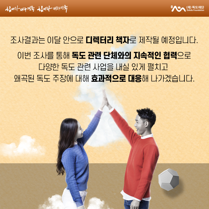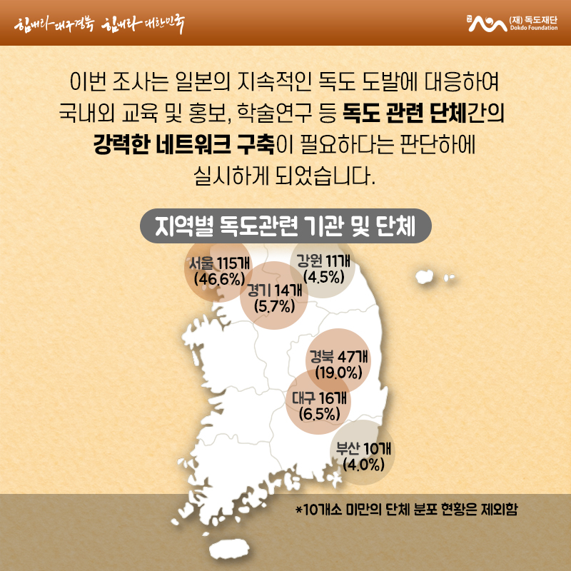 재단은 일본의 지속적인 독도 도발에 대응하여 국내외에서 독도의 진실을 알리기 위한 교육 및 홍보, 학술·연구 등의 활동을 전개하기 위해 독도관련단체간의 활발한 교류와 우의를 통해 강력한 네트워크 구축이 필요하다고 판단하여 기초자료가 되는 독도관련 기관 및 단체 현황에 대한 조사를 실시하였다.