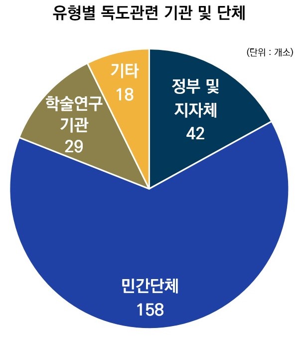 조사는 중앙부처별 비영리법인 등록현황, 중앙 및 시·도 비영리 민간단체 등록현황, 해양수산부·동북아역사재단 독도관련 민간단체 육성·지원 현황, 최근 5년 간(2015∼2020년 1월) 학회 논문 투고 여부와 학술기관검색결과의 설립목적, 주요사업, 단행본 발간실적 등을 종합한 대학 부설연구소 등을 대상으로 총 16,698곳을 취합하였다. 이 중 최종적으로 정부 및 지자체 42곳, 등록 및 미등록 민간단체 158곳, 대학교 부설 연구소 및 학술단체(학회) 29곳, 기타(해외 및 산업관련 단체) 18곳 등으로 조사되었다.