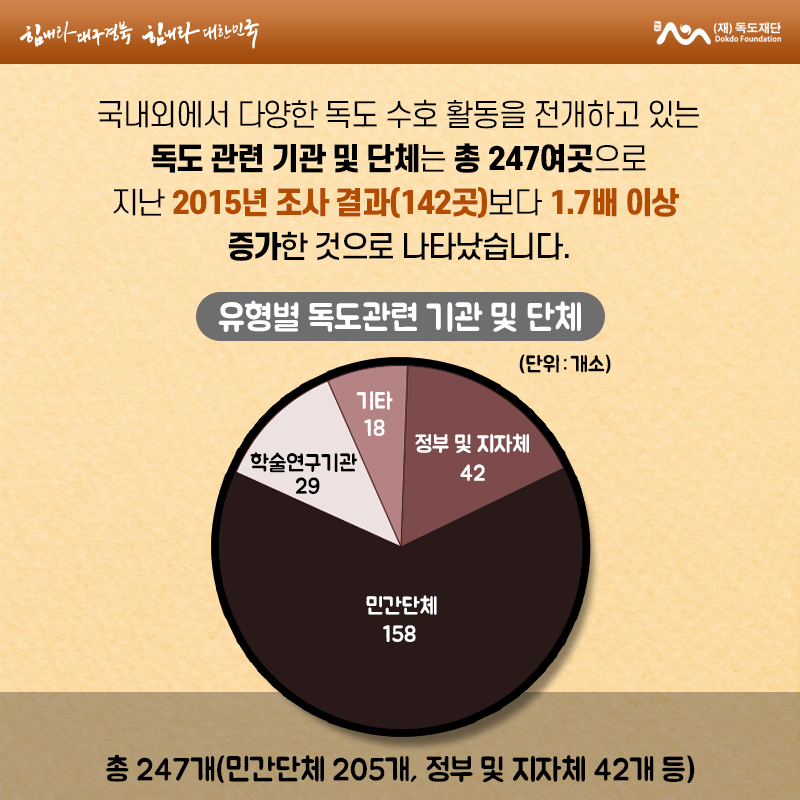 국내외에서 다양한 독도수호활동을 전개하고 있는 독도관련 기관 및 단체는 약 250여 곳으로 경상북도 출연기관인 (재)독도재단의 조사 결과로 나타났다. 이는 지난 2015년 조사 결과(142곳)보다 약 1.7배 이상 증가한 수치이다.