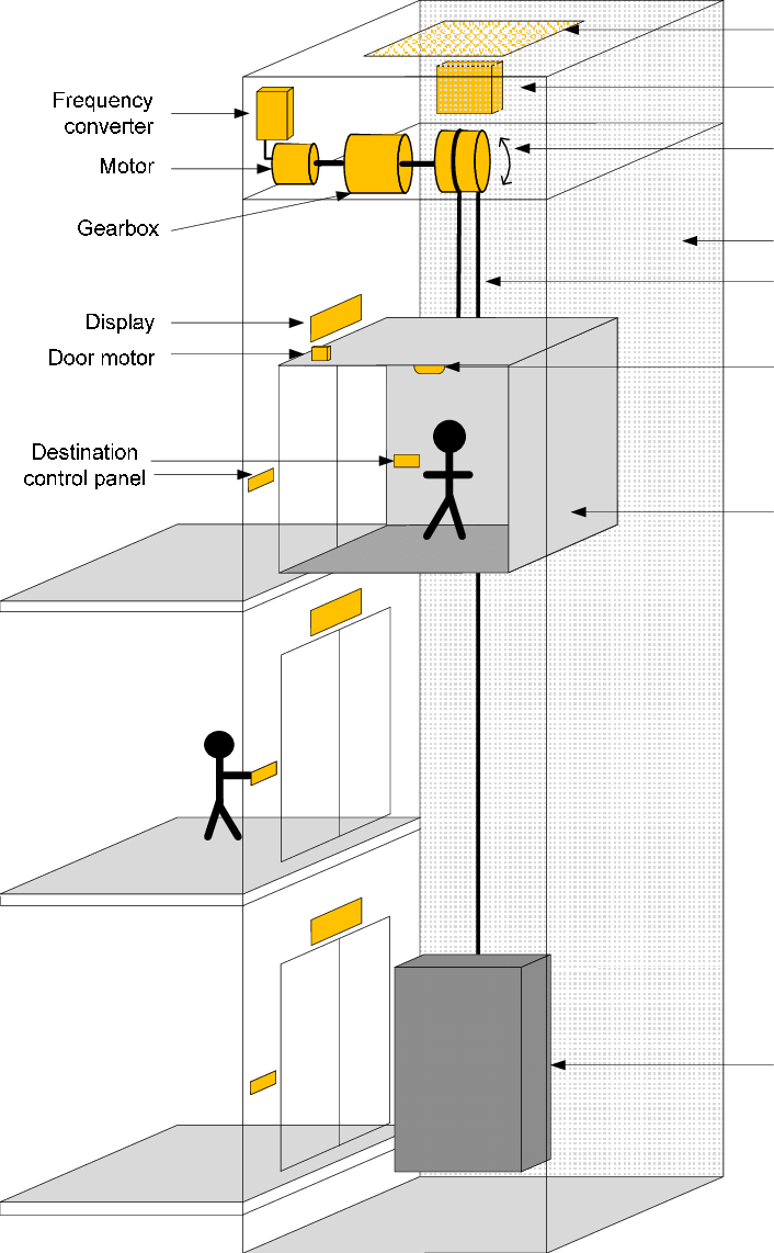 | 엘리베이터(Elevator) 동력을 사용하여 사람이나 화물을 아래위로 나르는 장치. 미국 등 대부분은 Elevator, 영국에서는 Lift 라 부른다. |