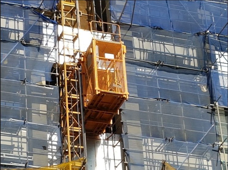 고층건물 공사현장에서 사용되는 옥외리프트로 로프가 없다.