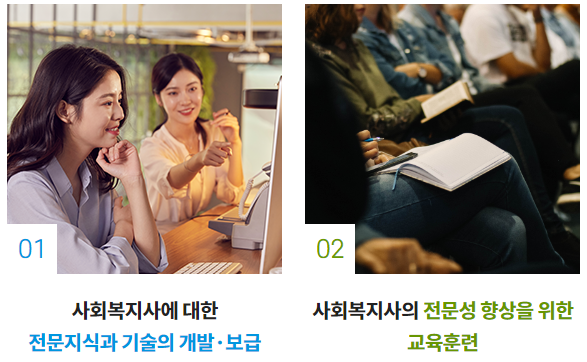 (설립목적) 사회복지에 관한 전문지식과 기술을 개발·보급하고 사회복지사의 자질향상을 위한 교육훈련 및 사회복지사의 복지증진을 도모하기 위해 설립