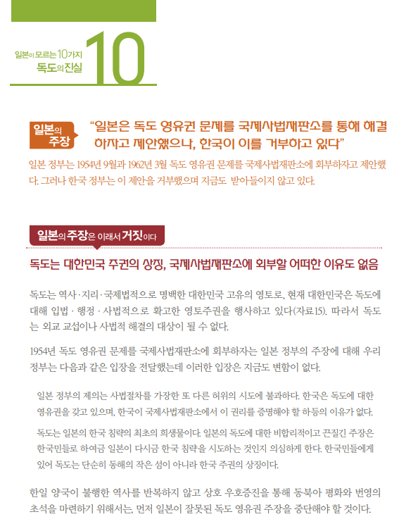 10. 독도는 대한민국 주권의 상징, 국제사법재판소에 회부할 어떠한 이유도 없음