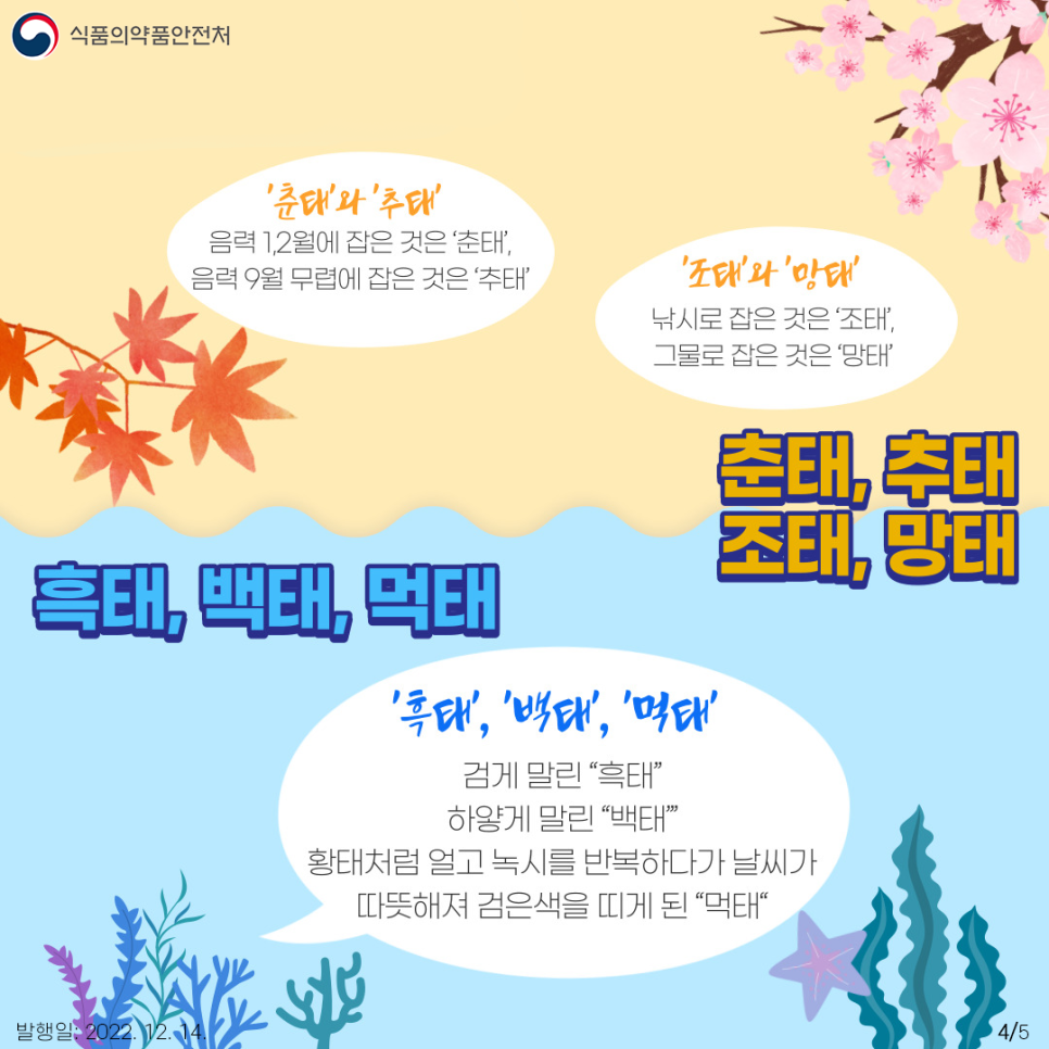 일태 , 이태, 삼태... 십이태: 어획시기에 따라 부르는 명칭.