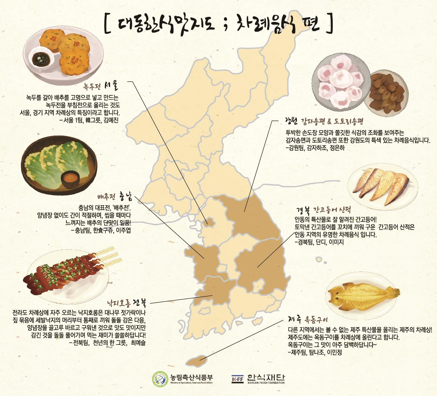 서울의 녹두전, 강원 감자송편, 충남 배추전, 전북 낙지호롱, 경북 간 고등어 산적, 제주 옥돔구이 등이 있는데 역시나 다른 지역에서 맛볼 수 없는 특별한 음식들입니다.