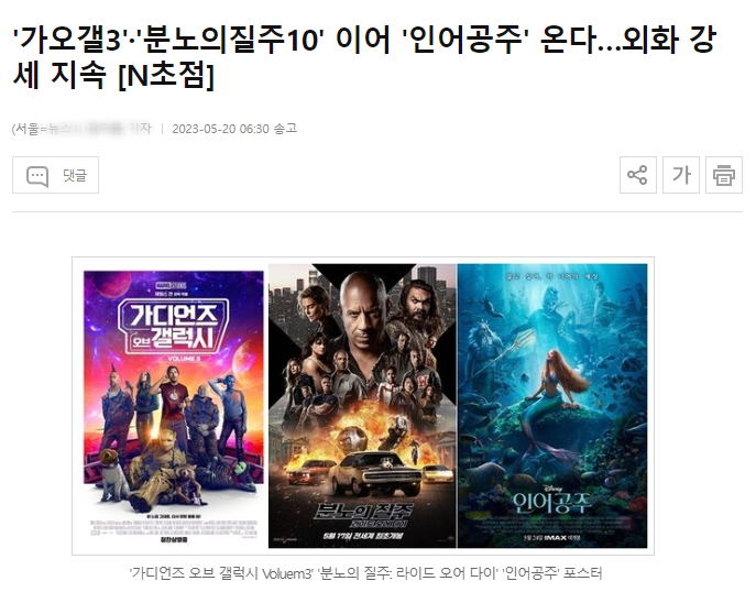 영화명 : 가디언즈 오브 갤럭시: Volume 3 개봉일 : 2023년 5월 3일 관람등급 : 12세이상 관람가 런닝타임 : 150분 관객수 : 3,478,809 명 (2023.05.25. 기준) |