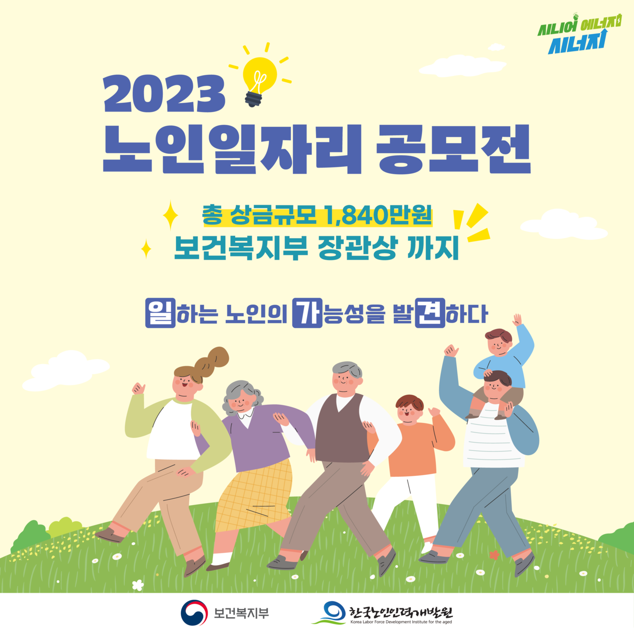 - 안녕하세요. 한국노인인력개발원에서는 노인일자리 및 사회활동지원사업의 사회적 가치를 제고하고 노인에 대한 긍정적 이미지를 알리기 위해 「2023년 노인일자리 공모전」을 아래와 같이 개최합니다.