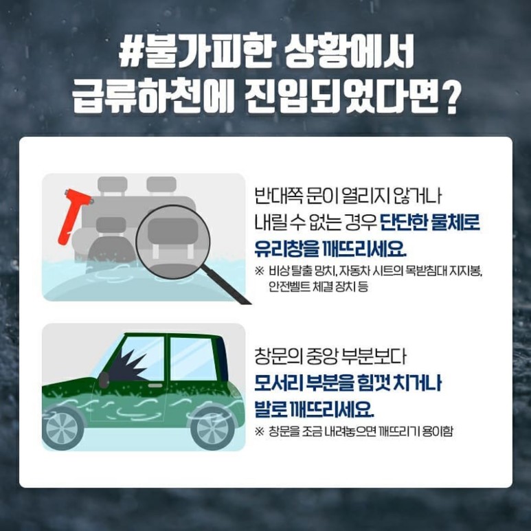 내·외부 수압 차이로 차량 문이 열리지 않는 것에 대비해 창문을 미리 열어두세요.