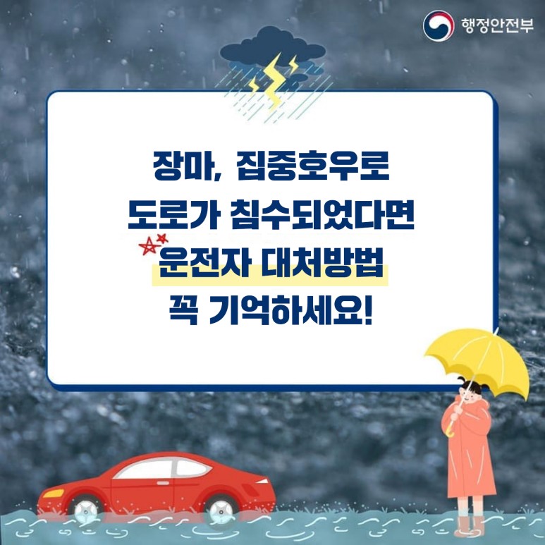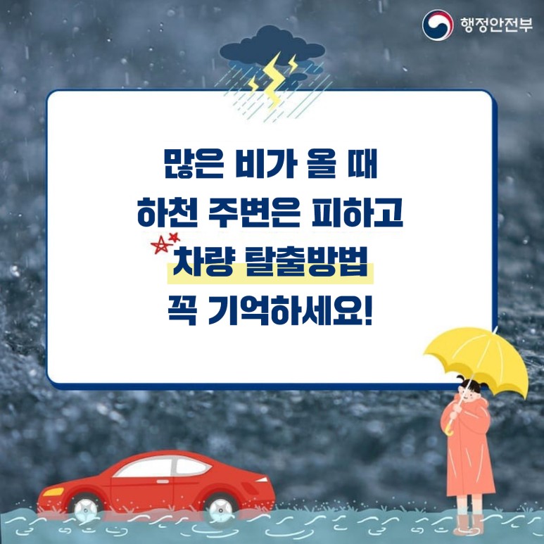 승용차 기준 타이어 높이의 2/3이상이 잠기기 전에 차량을 안전한 곳으로 이동하세요.
