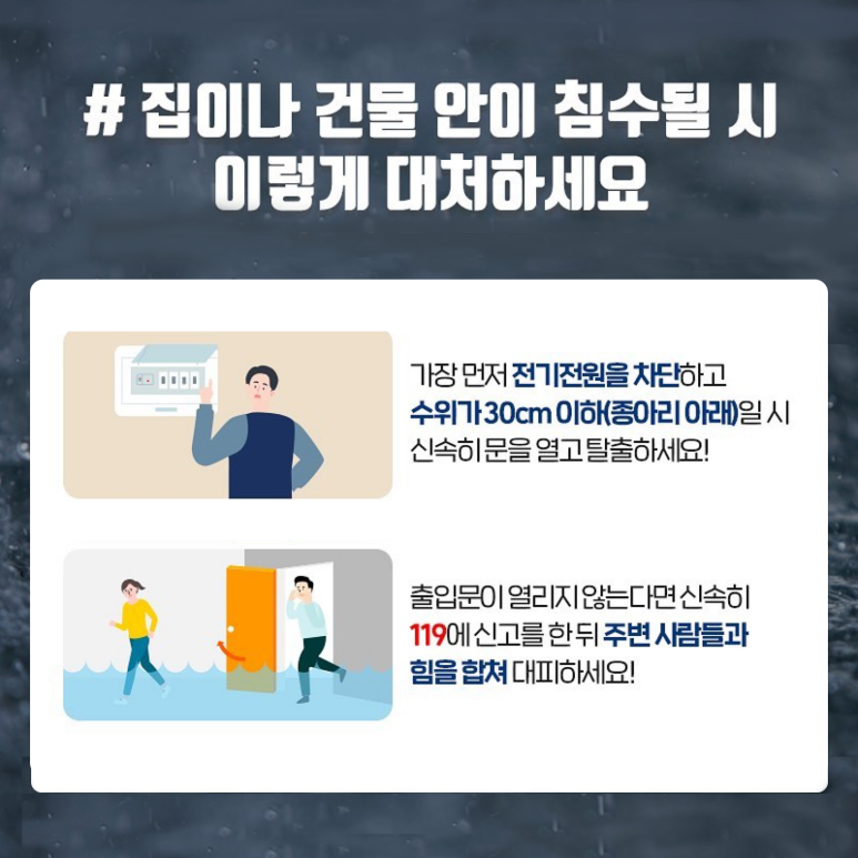 가장 먼저 전기전원을 차단하고, 수위가 30cm 이하(종아리 아래)일 시 신속히 문을 열고 탈출하세요.