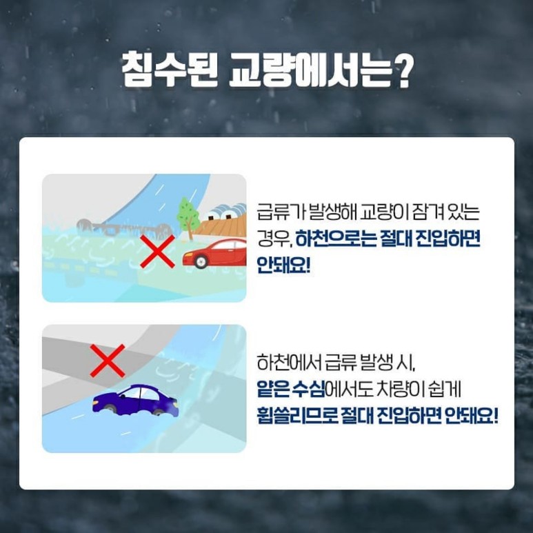 집중호우 발생 시, 이렇게 대처하세요!(실내침수, 도로침수, 교량침수)
