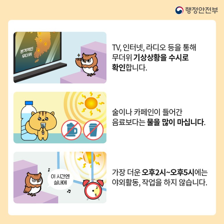 - TV, 인터넷, 라디오 등을 통해 무더위 기상상황을 수시로 확인합니다.
