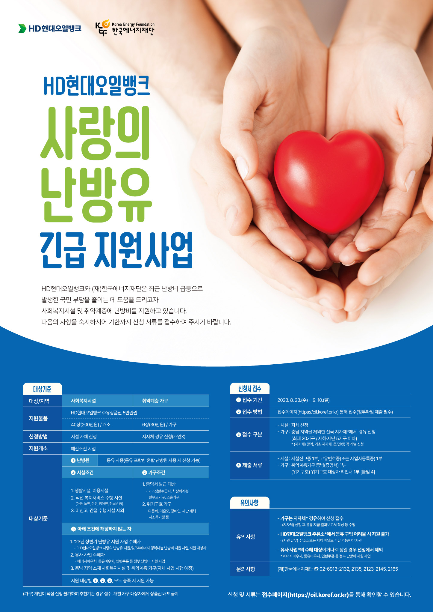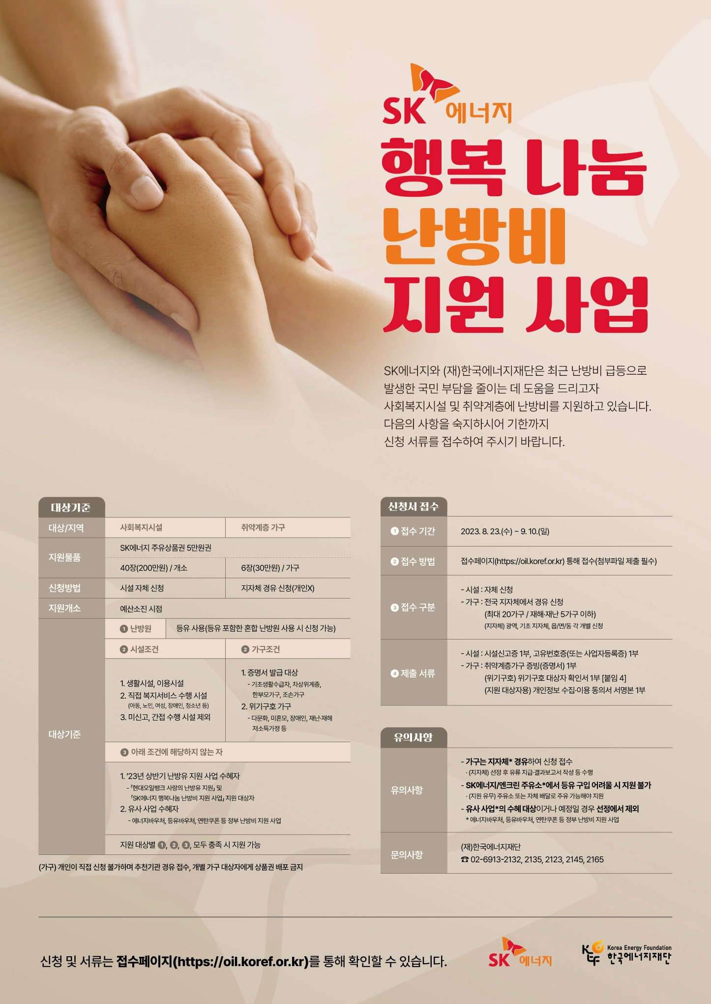 한국에너지재단에서는 2023년 동절기를 대비하여 에너지 취약계층 가구, 사회복지시설을 대상으로 난방유를 지원해 에너지복지 향상을 도모하고자 다음과 같이 SK에너지, HD현대오일뱅크와 함께 난방비 지원사업을 실시하니 참고하셔서 많은 신청있으시기 바랍니다.