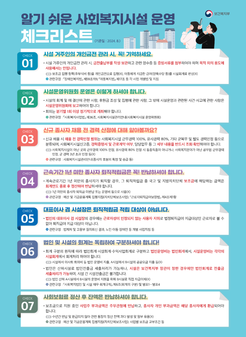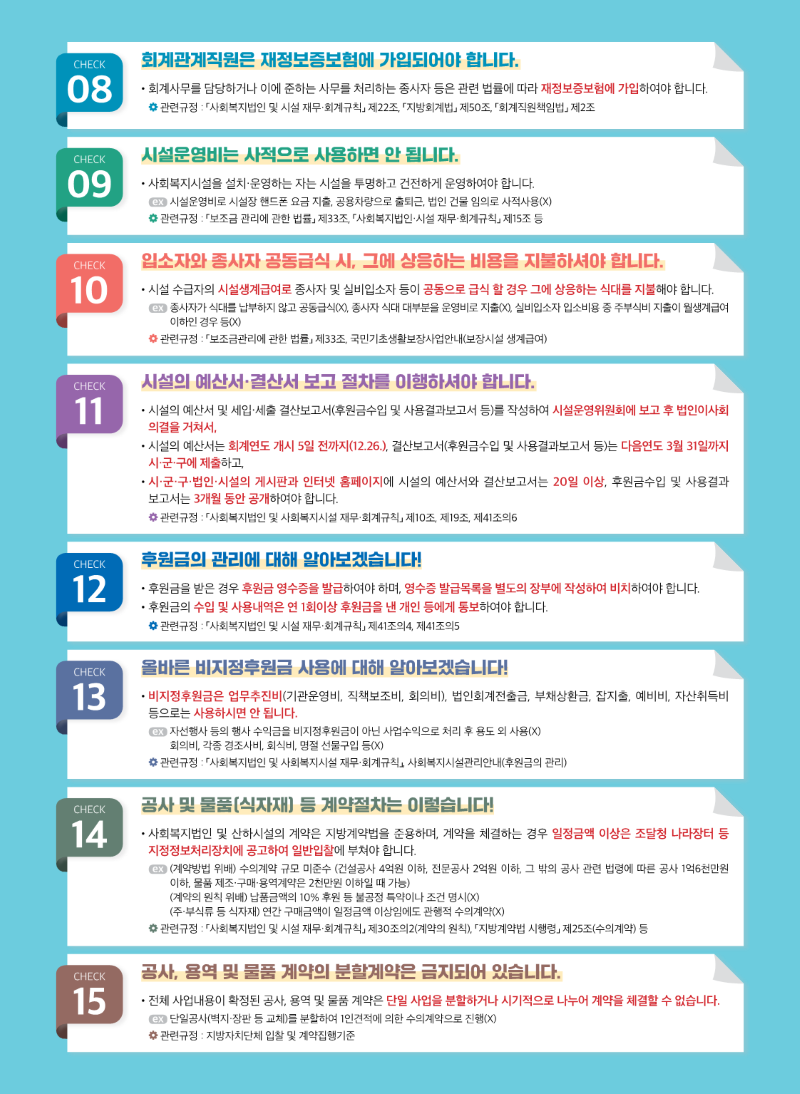 각 항목들을 잘 읽어보시고 사회복지시설 운영에 더욱 효율적으로 적용해보시기 바랍니다.